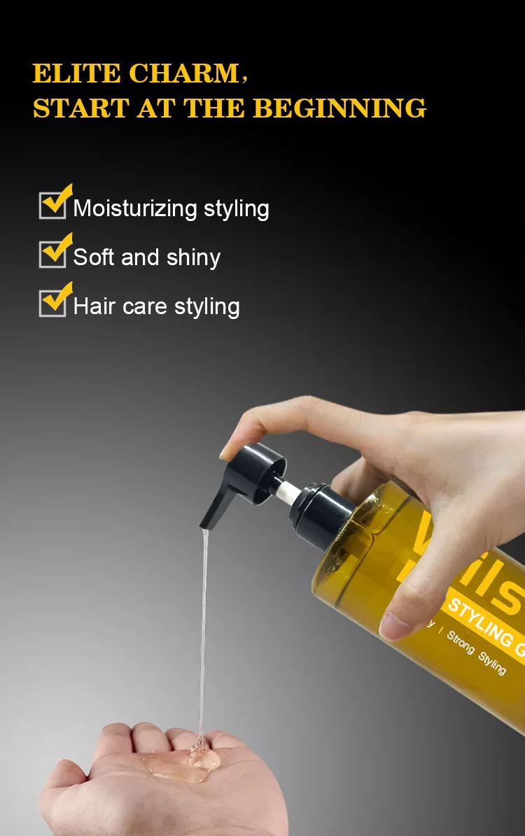 विल्सन पुरुषको अल्ट्रा स्मूथ सिमलेस हेयर स्टाइलिंग जेल कस्मेटिक्सले कपालको स्टाइल र कपालमा स्प्रे गरिएको वा लागू गर्ने, कपालमा विलायक वाष्पीकरण र सुकाउने पारदर्शी फिल्म बनाउनको लागि कपालको स्टाइल र परिमार्जन गर्ने प्रभावलाई जनाउँछ, ताकि कपालको फाइबरलाई कडा बनाउन र विभिन्न कपाल शैलीका आवश्यकताहरू पूरा गर्न उद्देश्यको आकार कायम राख्न।